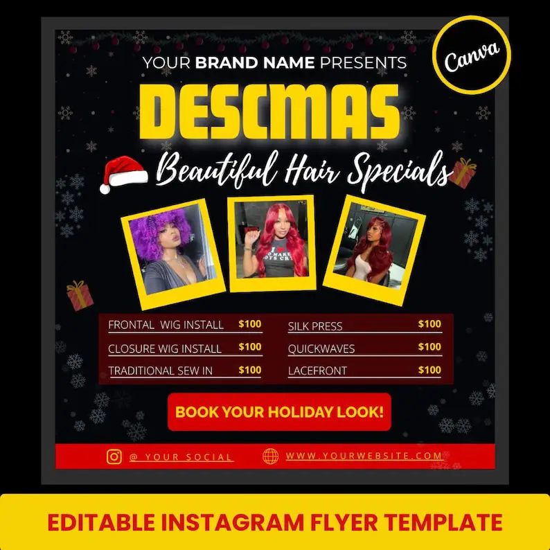 Promote your holiday services in style with this December & Christmas Booking Flyer Canva Template. Designed specifically for the festive season, this flyer is perfect for beauty professionals offering hair, wigs, lashes, nails, makeup, or spa services during the busy Christmas period.